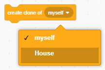 The “create clone of myself” block creates a copy that lasts only when the program is running. You can select another sprite’s name from the drop-down menu to create clone of the other sprite.