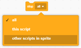 The “stop all” block stops all scripts in all sprites including the background. You can select “this script” from the drop-down menu to stop the current script. Selecting “other scripts in sprite” from the drop-down menu will stop the other scripts in the sprite.