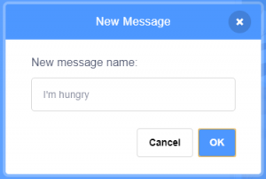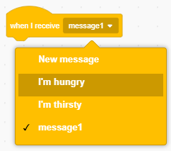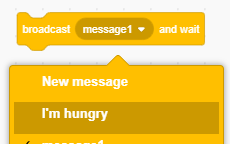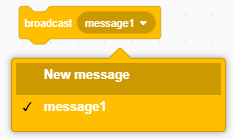 The “broadcast message1” block sends a message to all sprites including the background. We can create and name new messages.