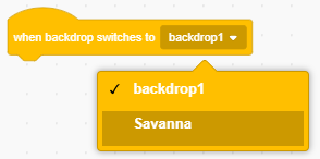 The “when backdrop switches to backdrop1” block runs the script attached to it when the backdrop switches to the specified backdrop. You can select the backdrop you want from the drop-down menu.