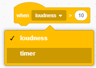 The “when loudness > 10” block runs the script attached to it when the loudness is greater than 10. You can select “timer” from the drop-down menu and change the number 10 to any number you want.