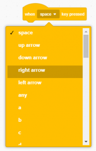 The “when space key pressed” block runs the script attached to it when the specified key is pressed. You can select a key from the drop-down menu.