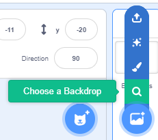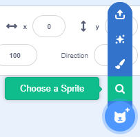 Then move your mouse over the little cat sprite with a plus sign above it. A long blue menu will pop straight upwards. Click the little search icon that says, “Choose a Sprite.”
