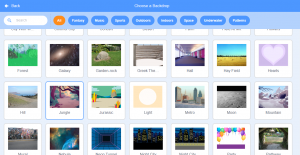 We also need a backdrop. Hover your mouse over the grassy background with a plus sign above it and you’ll find a menu stretch upwards. Select the search icon.