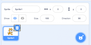 Let’s begin with our flying parrot project. Click the little trash bin next to the cat sprite to delete it.