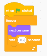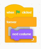 Go to the looks blocks and get a “next costume” block. Drag it inside the “forever” block.
