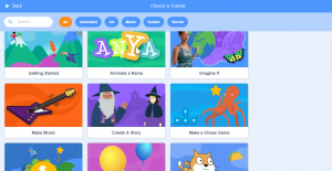 If you want more projects, you can see the tutorials. In the tutorial menu, you will find very interesting projects like games, art programs, music programs, stories, and more. You will find the light bulb next to the text saying, “Tutorials”. Click on the text of light bulb and you’ll find a large tutorial menu with many categories to choose what kind of project you want to make.