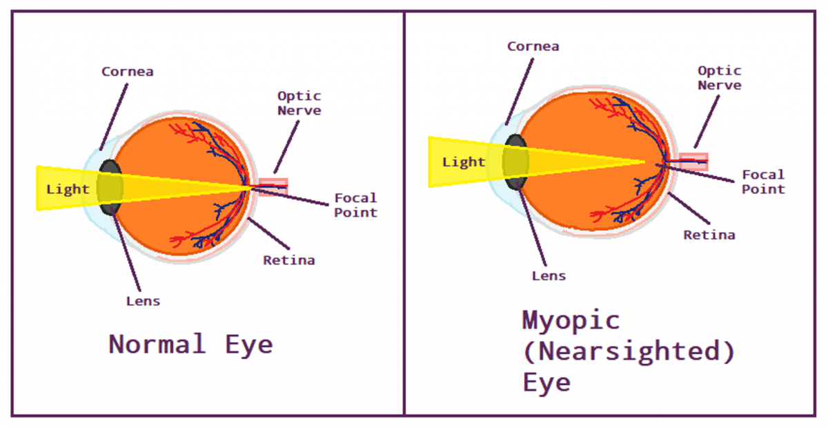 Myopia, also called “nearsightedness” or “shortsightedness” causes distant objects to appear blurry. In a normal eye, light first reaches the cornea, the clear structure in the front of the eye. The cornea helps bend light directly to one focal point: the retina. Because a nearsighted eyeball is longer than a normal eyeball, light is focused before of the retina instead of being focused onto the retina. This leads to blurred distant vision. The higher the myopia prescription is, the more blurred distant objects appear. Myopia is very common in children.